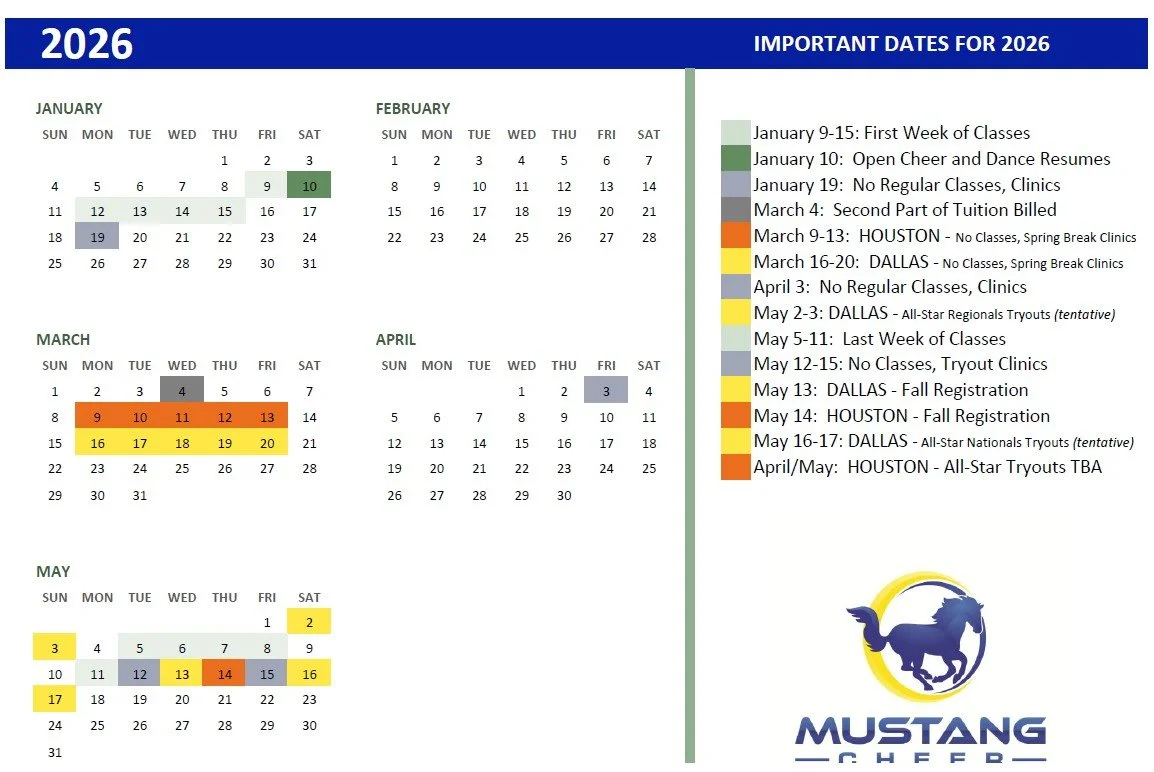 Mustang Cheer DALLAS AND HOUSTON - 2026 Spring Semester Class Schedule