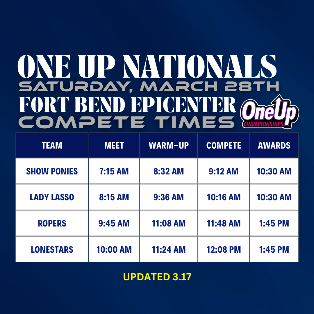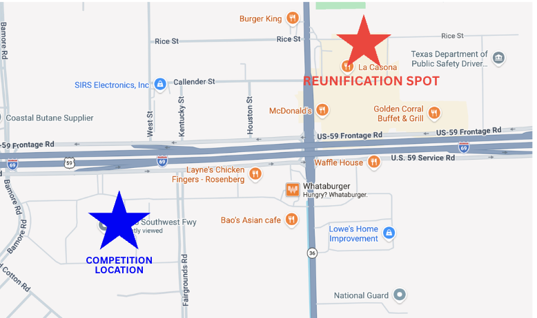 If an emergency occurs during the competition at The Fort Bend Epicenter, Mustang Cheer families will meet at our designated reunification location: La Casona Mexican Restaurant located at, 28000 Southwest Fwy, Rosenberg, TX 77471