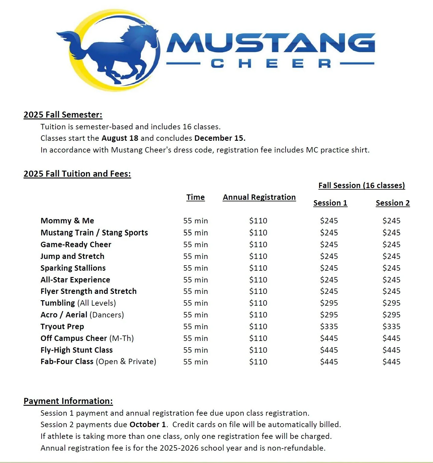 Mustang Cheer requires an annual registration fee of $110 for all athletes. The annual registration fee is paid at the time of registration prior to the commencement of classes.  Athletes who join halfway through the year (January and later) will be subject to a prorated registration fee of $55. Annual registration fee is for the 2025-2026 school year and is non-refundable.